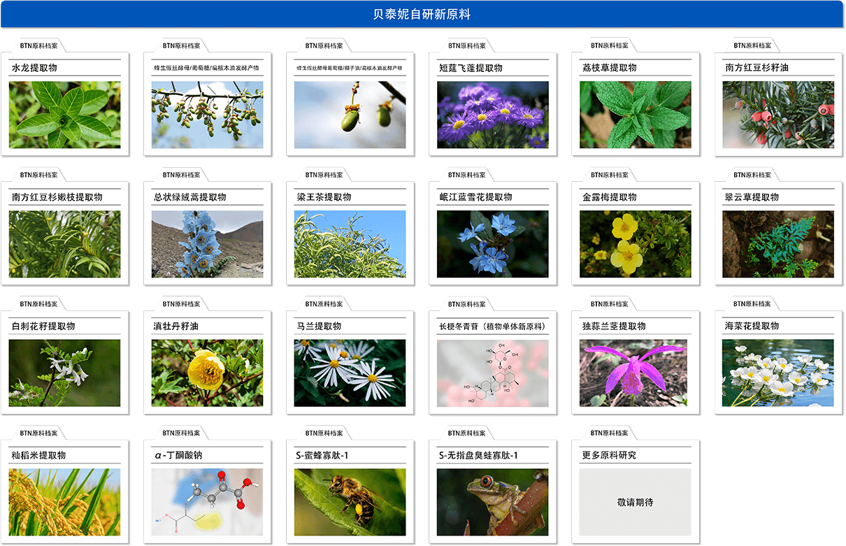 自主研发功效明确、质量可控的植物活性物,同时筛选全球范围原料